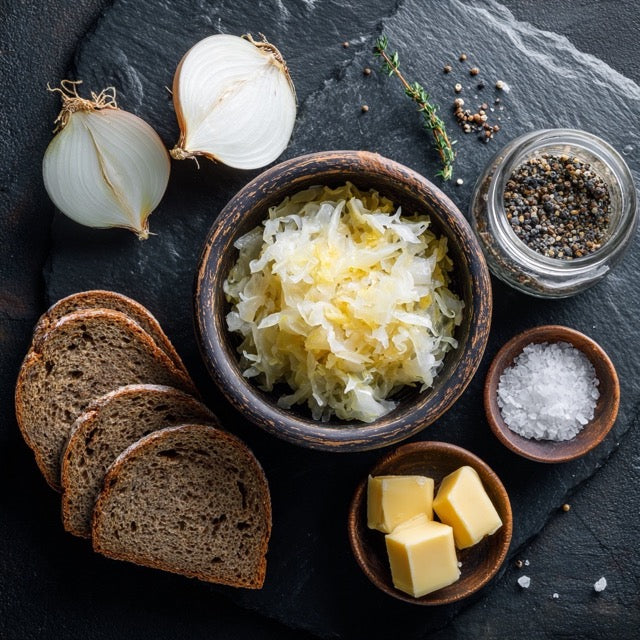 Sauerkraut mit Zwiebel, Butter und Kümmel erhitzen, leicht köcheln lassen. Brot in Scheiben schneiden, rösten.
