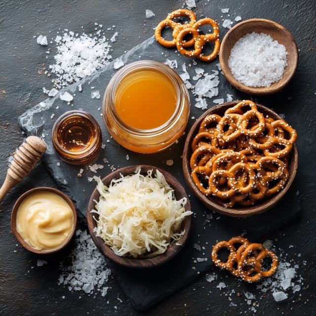 Dip aus Senf, Honig, Essig & Sahne/Joghurt anrühren. Sauerkraut erwärmen, leicht abschmecken.