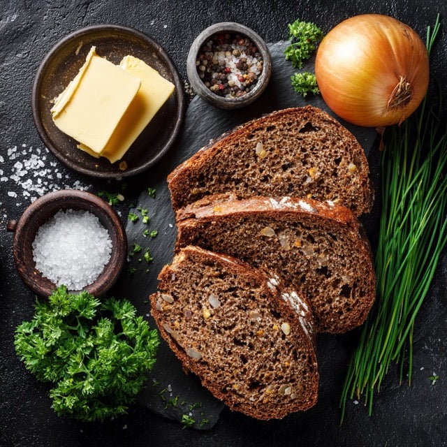 Apfel und Zwiebel fein würfeln. Brot in Scheiben schneiden und rösten.