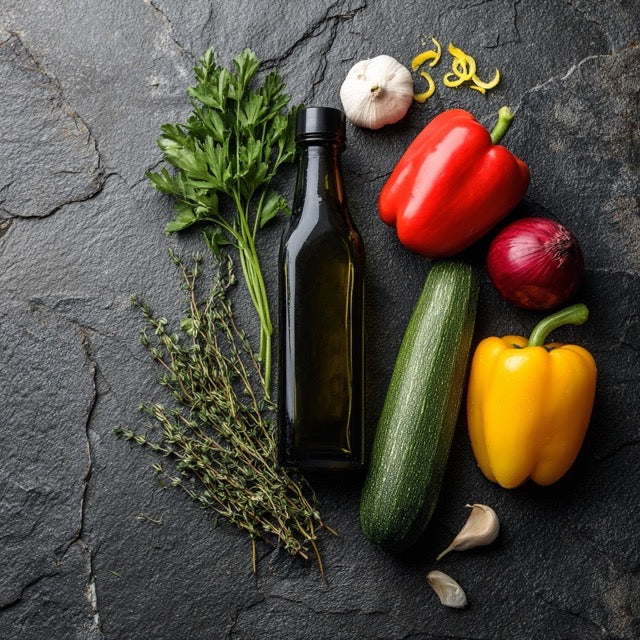 Gemüse grob schneiden, mit Öl und Salz marinieren. Kräuteröl ansetzen: Öl leicht erwärmen, mit gehackten Kräutern, Knoblauch und Zitrone aromatisieren.