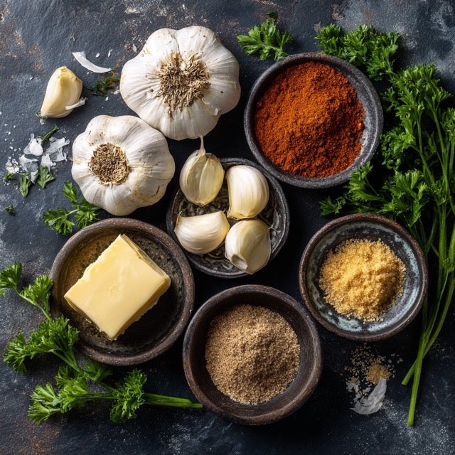 Fleisch mindestens 1 Stunde vorher aus dem Kühlschrank nehmen. Rub mischen, Knoblauchbutter vorbereiten.