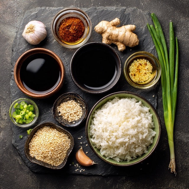 Rib Fingers leicht gebogen oder gefächert angerichtet, glänzend glasiert, Reis daneben, Frühlingslauch & Sesam gestreut