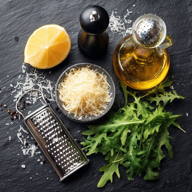 Parmesanchips vorbereiten: Parmesan in Häufchen auf Backpapier, kurz im Ofen goldbraun backen (ca. 5 Min bei 200 °C).