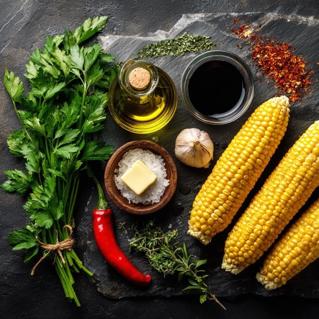 Chimichurri anrühren, kalt stellen. Mais vorgaren, dann mit Butter einreiben. Fleisch mit Öl einreiben und salzen.
